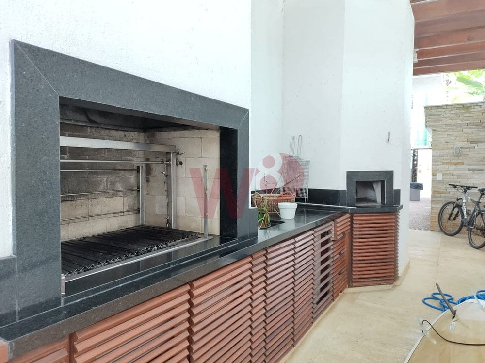 O condomínio oferece serviço de praia, portaria 24h e zeladoria.