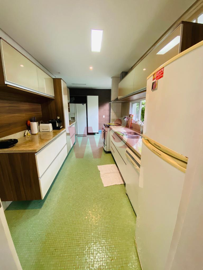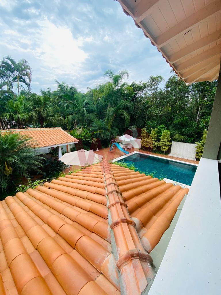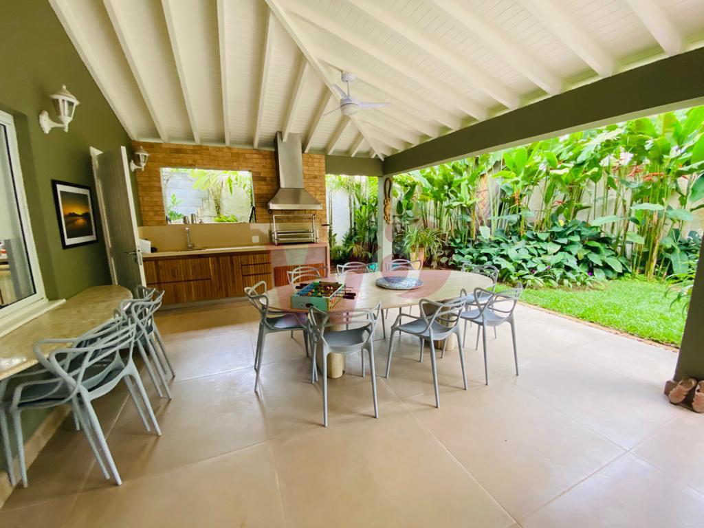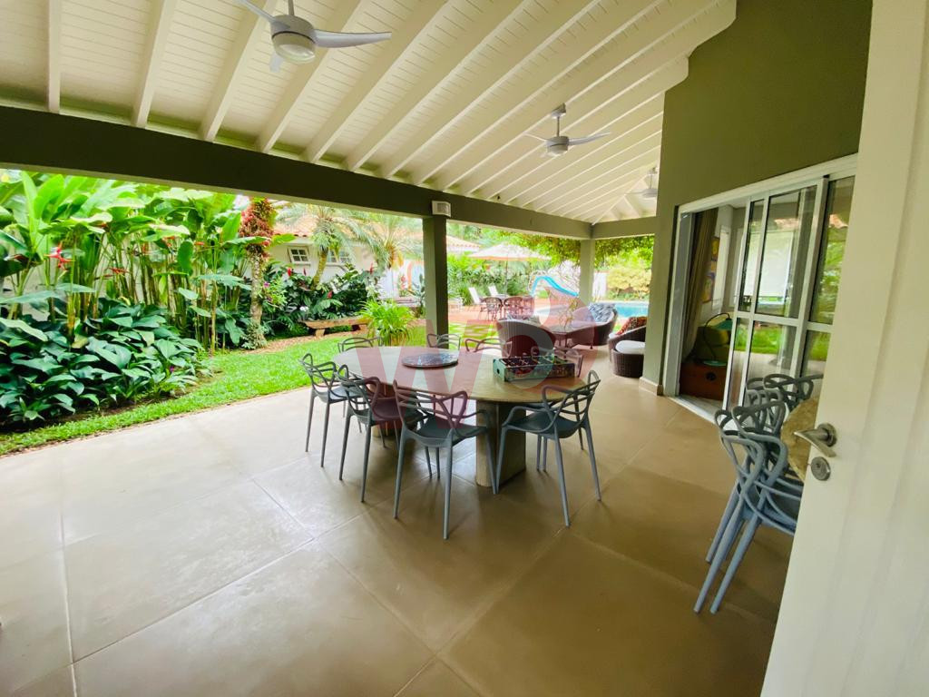 Uma belíssima casa composta por 6 suítes com tv, ar condicionado e ventilador sendo, 4 suítes no piso superior e 3 suítes no térreo, salas de tv, sala de jantar, sala de estar com lareira, cozinha completa, área gourmet com churrasqueira, quintal com jacuzzi, piscina aquecida, sauna seca, vestiário externo com ducha, lavanderia, mesa de bilhar, wi-fi, 11 vagas para autos, vista para a mata, privacidade, distancia aproximada da praia 500m, por dentro do condomínio, capacidade para 14 pessoas.
