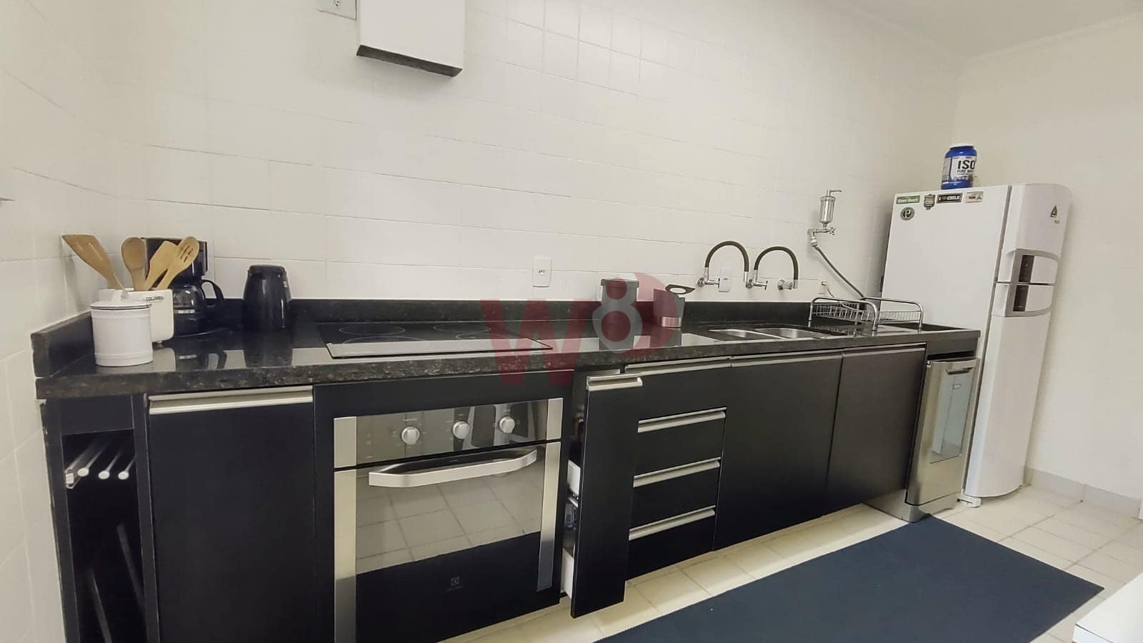 O condomínio oferece serviço de praia, quadra de tênis, zeladoria e portaria 24h.