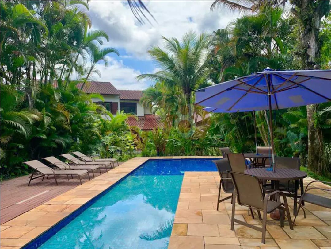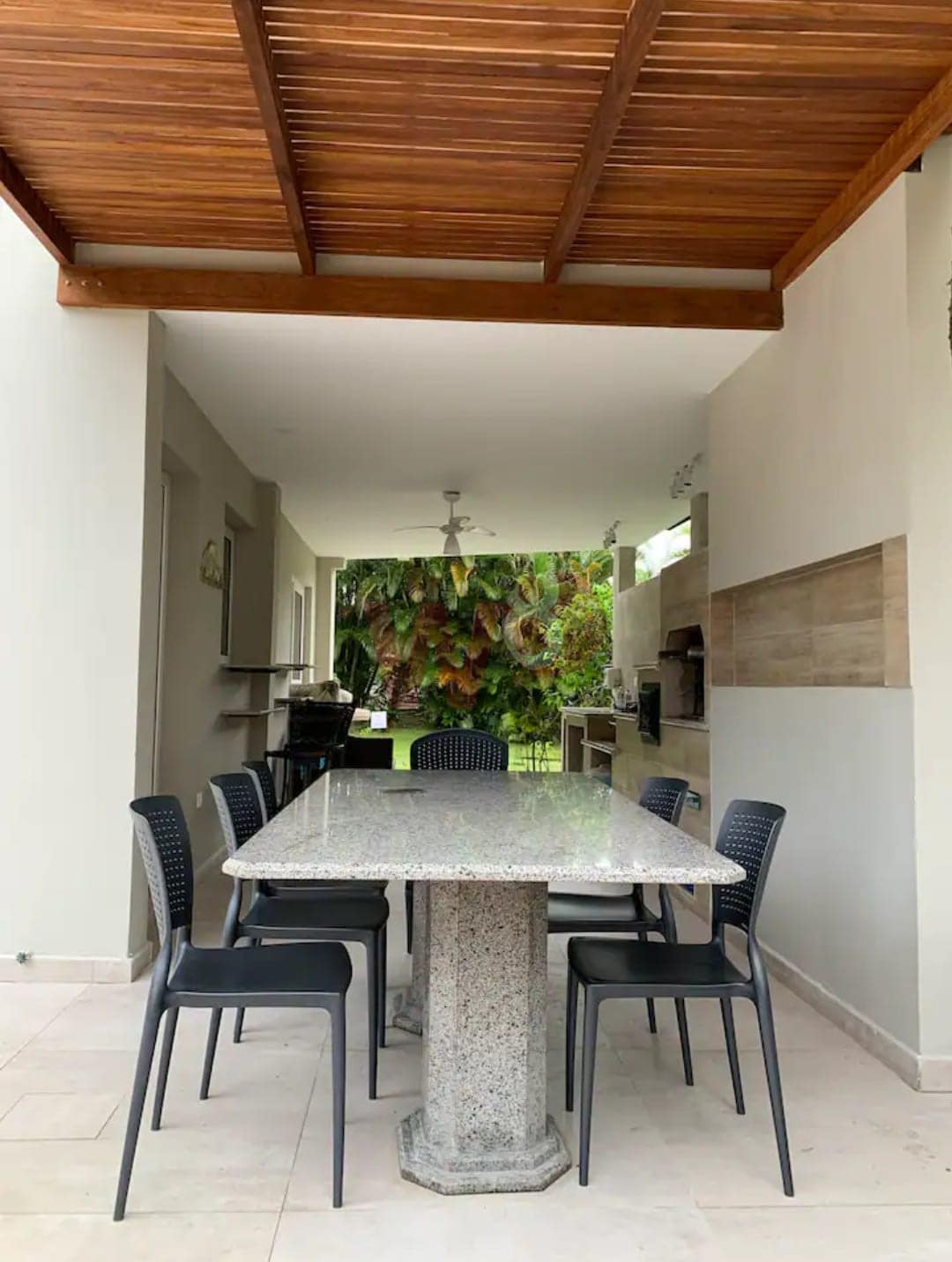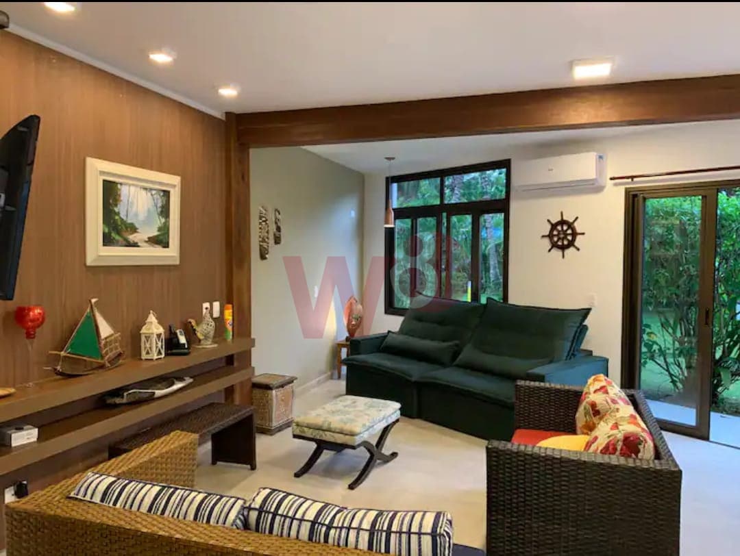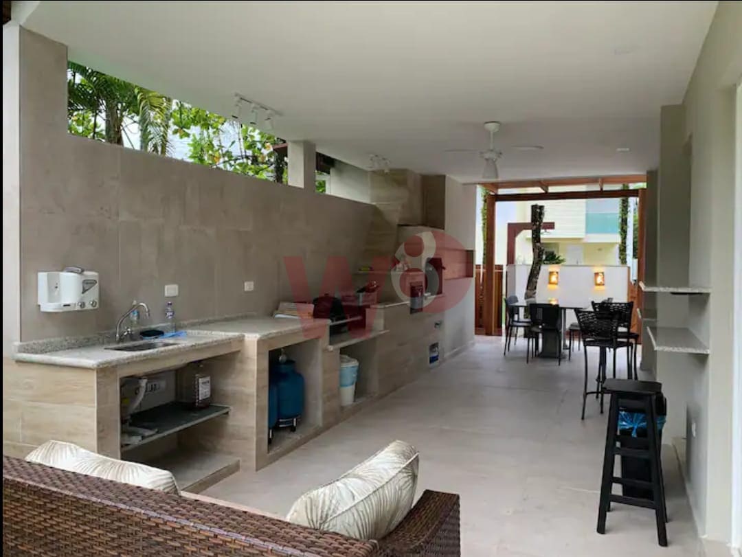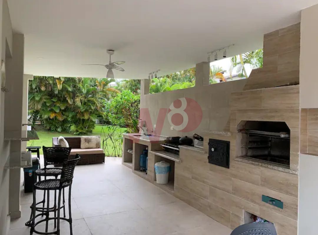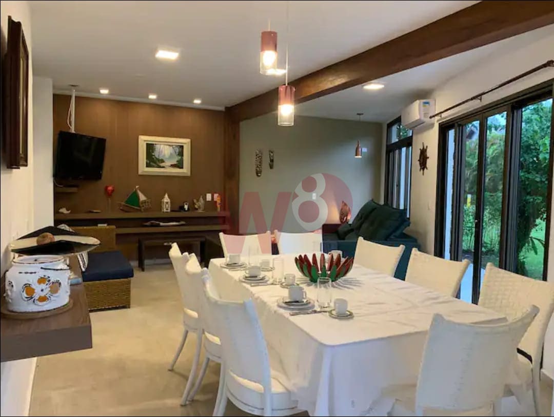 Localizada a, aproximadamente, 180 metros da praia, a casa possui 5 suítes sendo uma no andar térreo, lavabo, sala de estar é integrada com a sala de televisão e de jantar, varanda, área gourmet com churrasqueira, fogão a lenha e fogão cooktop á gas.